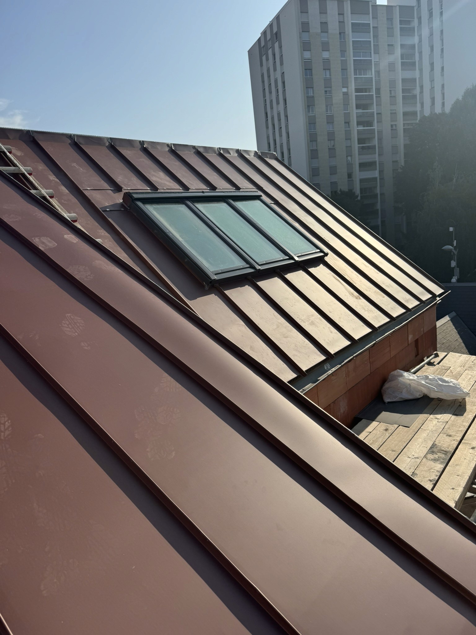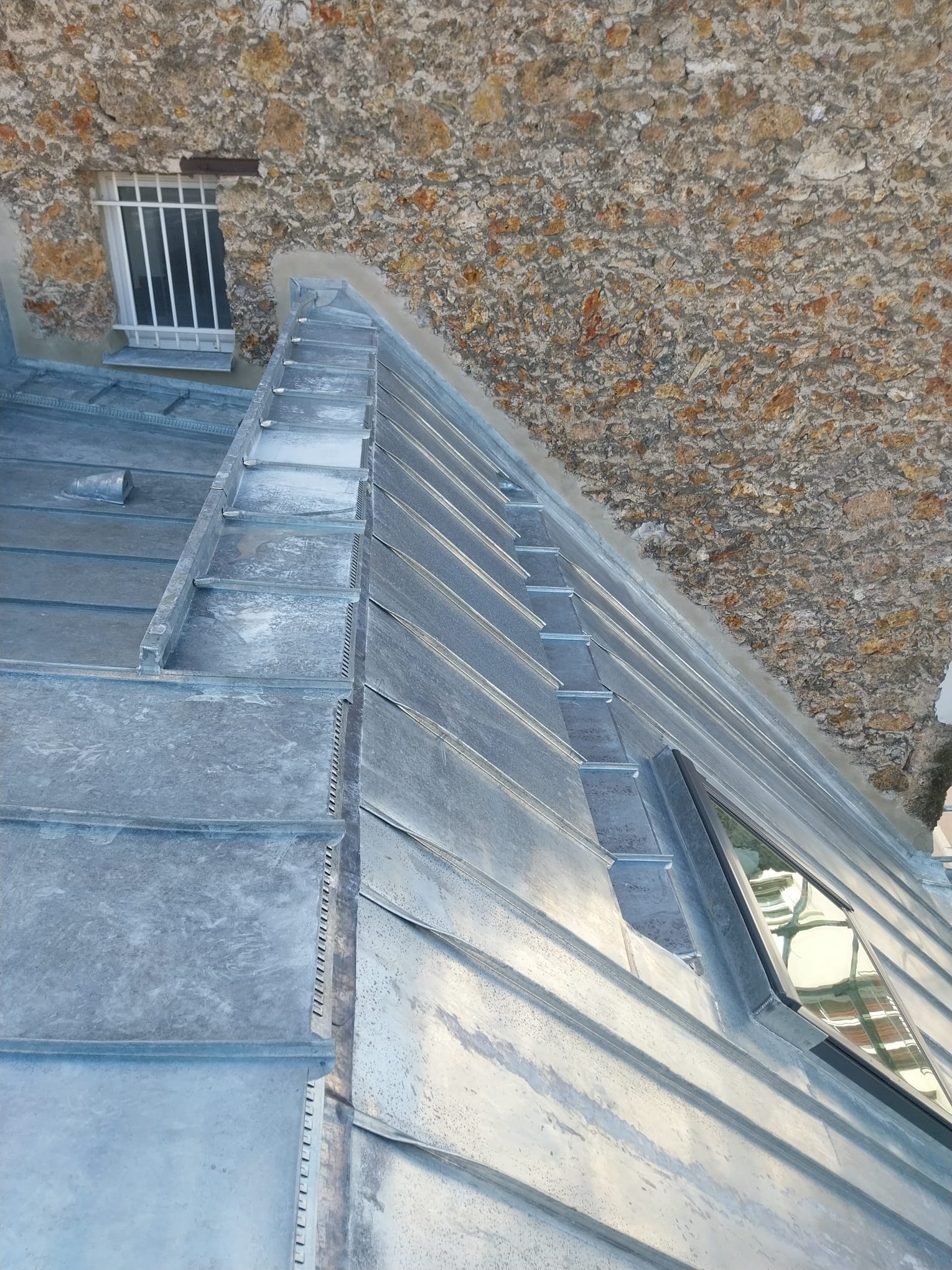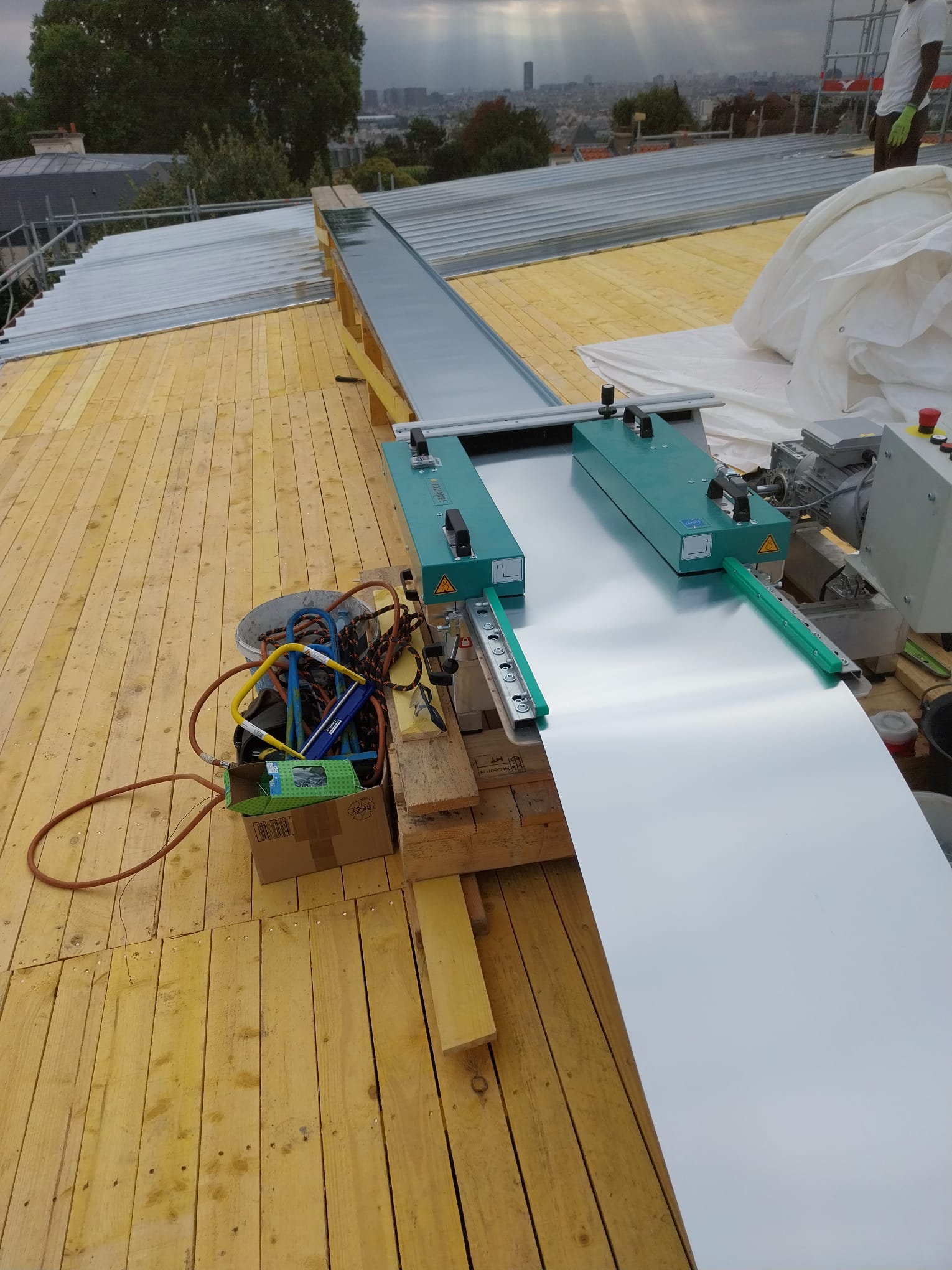 Les rouleaux de zinc sont profilés sur place, au sein de notre dépôt de stockage AERTOIT. Elles sont ensuite façonnés, serties mécaniquement et manuellement sur place pour créer le joint debout, qui garantit une étanchéité parfaite tout en conservant un aspect esthétique épuré.