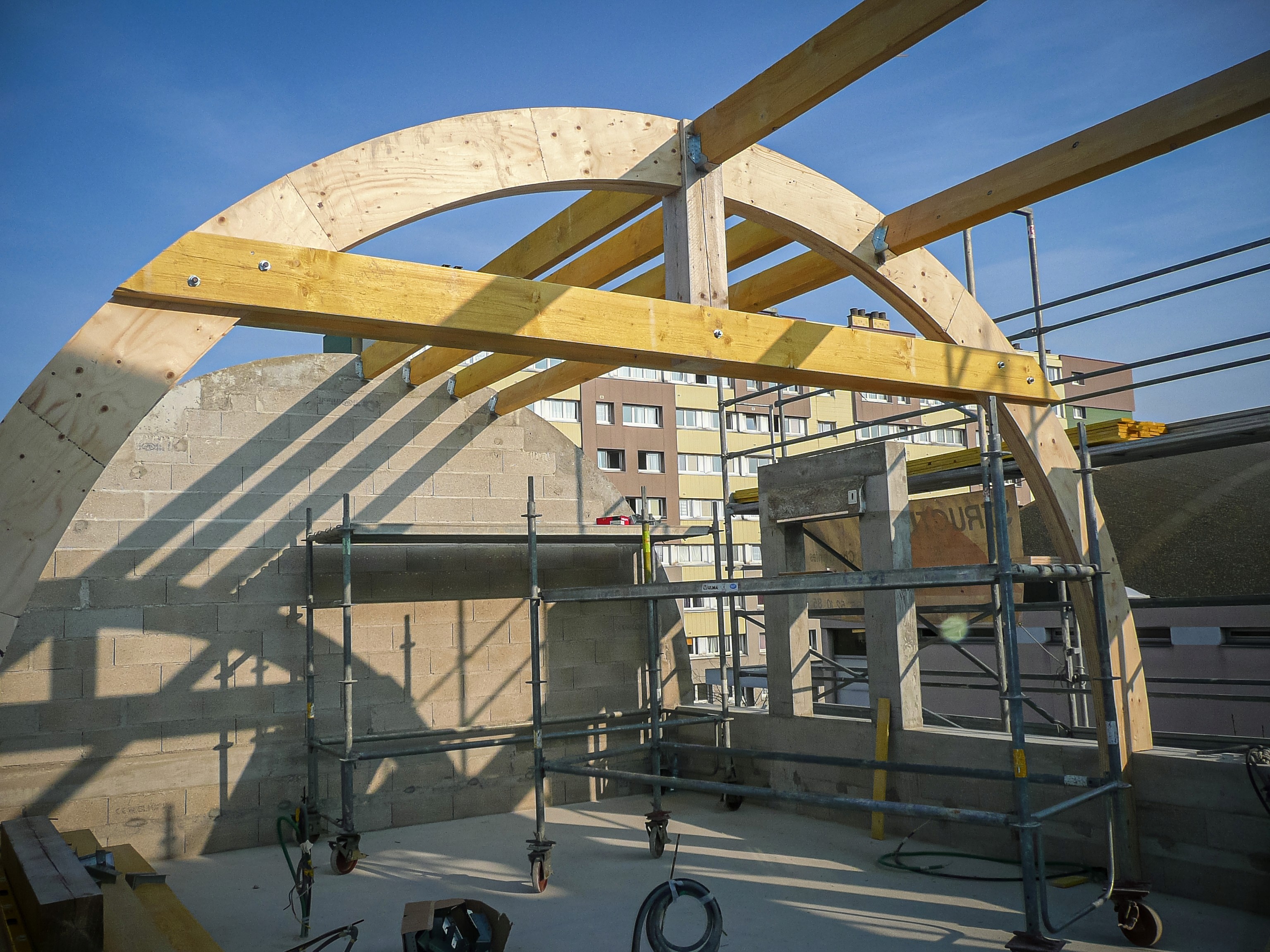 Nos locaux ont une surface dédiée à ce type de travaux, entre autres un emplacement nous permettant de réaliser les épures échelle 1 au sol, puis de procéder au tracé, à la taille des différents éléments et des assemblages traditionnels.